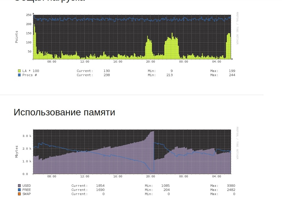 Чтобы обрабатывать запросы — серверу нужно выделять память, поэтому вы видите такие «горы» на графике. К пику когда подбирается — сервер автоматом делает релоад и память очищается (этим занимается программа Monit, которая установлена на сервере).