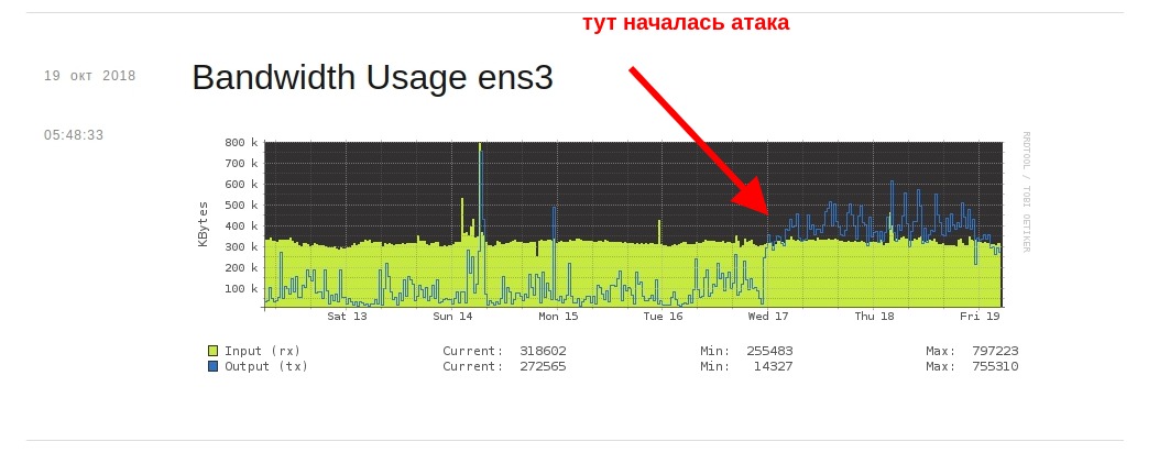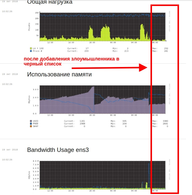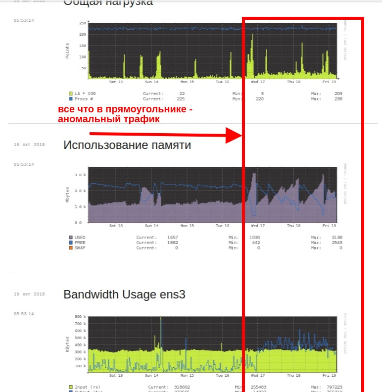 Как выглядят признаки DDOS на графике (в панели сервера):
