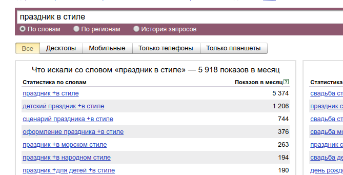 30К запросов, должен идти первым, потому что «праздник в стиле» всего 5К запросов.