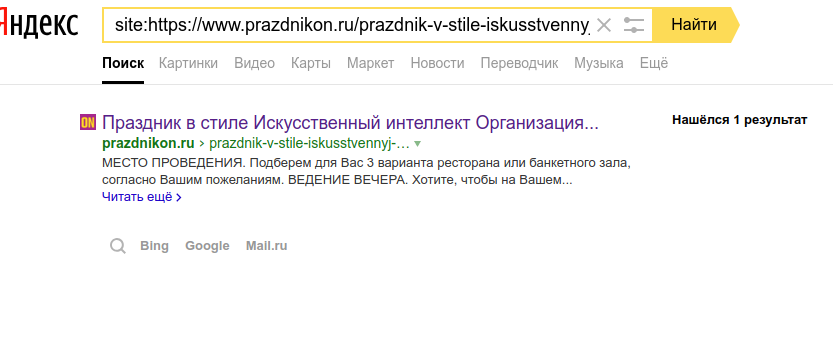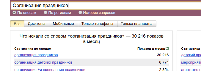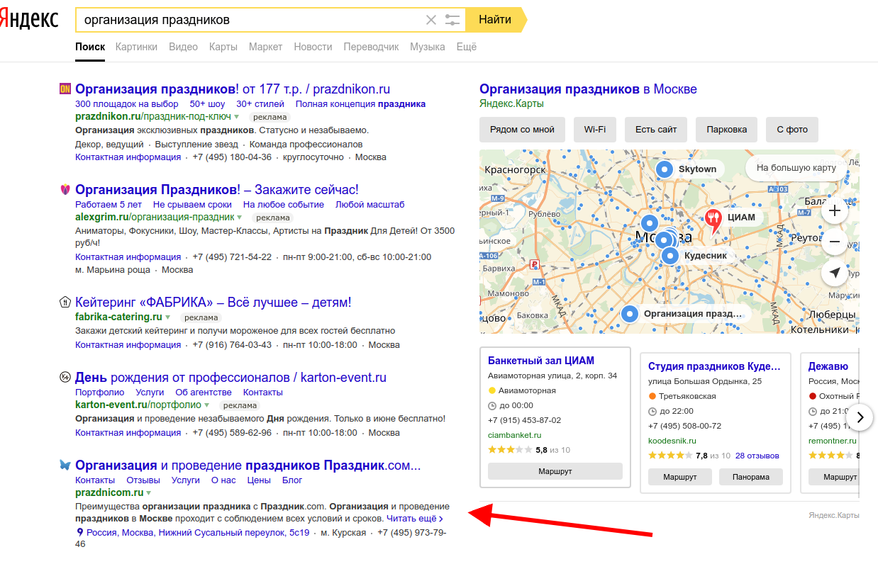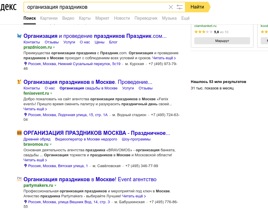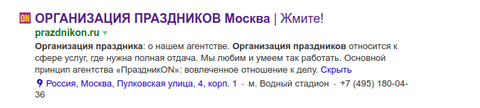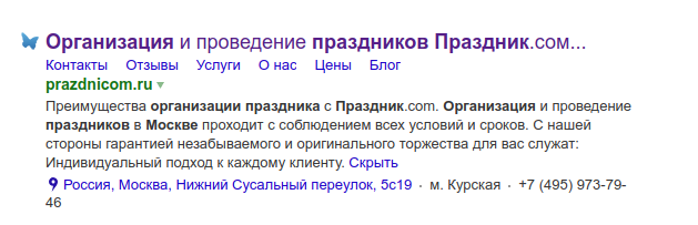 А по запросу «организация праздника» выходит другая страница сайта, но в ТОП-20 выдачи.